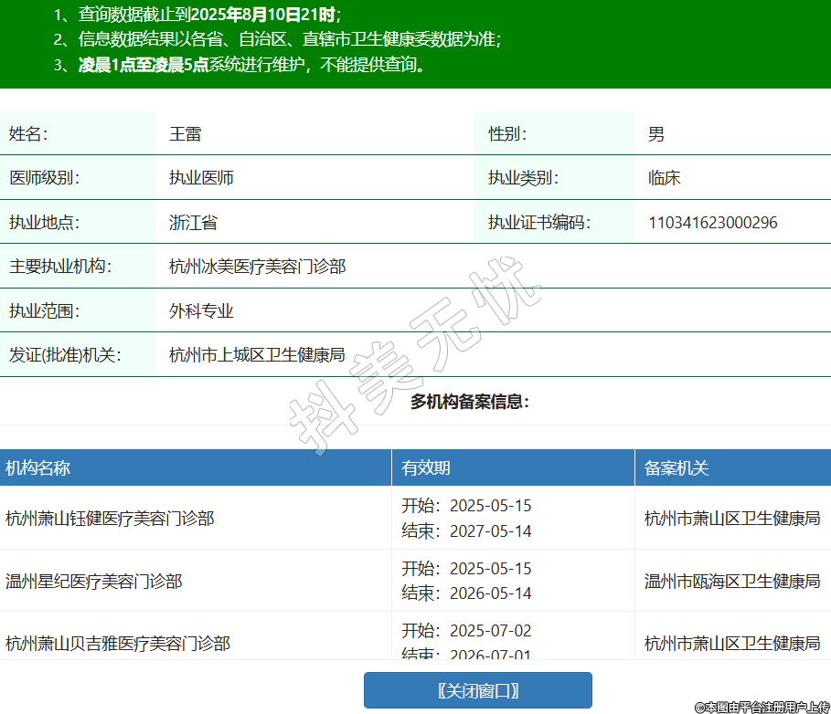 姓名:王雷性別:男醫(yī)師級(jí)別:執(zhí)業(yè)醫(yī)師執(zhí)業(yè)類別:臨床執(zhí)業(yè)地點(diǎn):浙江省執(zhí)業(yè)證書編碼:110341623000296主要執(zhí)業(yè)機(jī)構(gòu):杭州冰美醫(yī)療美容門診部執(zhí)業(yè)范圍:外科專業(yè)發(fā)證(批準(zhǔn))機(jī)關(guān):杭州市上城區(qū)衛(wèi)生健康局多機(jī)構(gòu)備案信息:機(jī)構(gòu)名稱 有效期 備案機(jī)關(guān) 杭州蕭山鈺健醫(yī)療美容門診部 開始:2025-05-15結(jié)束:2027-05-14杭州市蕭山區(qū)衛(wèi)生健康局 溫州星紀(jì)醫(yī)療美容門診部 開始:2025-05-15結(jié)束:2026-05-14溫州市甌海區(qū)衛(wèi)生健康局 杭州蕭山貝吉雅醫(yī)療美容門診部 開始:2025-07-02結(jié)束:2026-07-01杭州市蕭山區(qū)衛(wèi)生健康局 -
