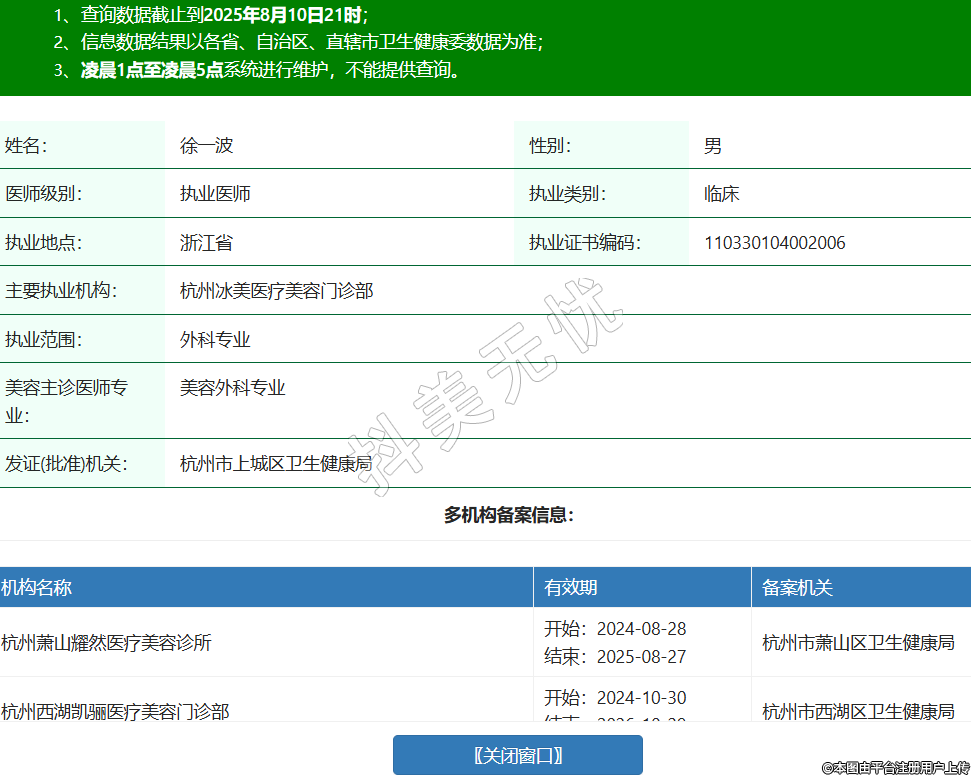 姓名:徐一波性別:男醫(yī)師級別:執(zhí)業(yè)醫(yī)師執(zhí)業(yè)類別:臨床執(zhí)業(yè)地點:浙江省執(zhí)業(yè)證書編碼:110330104002006主要執(zhí)業(yè)機構(gòu):杭州冰美醫(yī)療美容門診部執(zhí)業(yè)范圍:外科專業(yè)美容主診醫(yī)師專業(yè):美容外科專業(yè)發(fā)證(批準)機關:杭州市上城區(qū)衛(wèi)生健康局多機構(gòu)備案信息:機構(gòu)名稱 有效期 備案機關 杭州蕭山耀然醫(yī)療美容診所 開始:2024-08-28結(jié)束:2025-08-27杭州市蕭山區(qū)衛(wèi)生健康局 杭州西湖凱驪醫(yī)療美容門診部 開始:2024-10-30結(jié)束:2026-10-29杭州市西湖區(qū)衛(wèi)生健康局 杭州麗脂醫(yī)療科技有限公司和興路醫(yī)療美容門診部 開始:2024-12-17結(jié)束:2025-12-16杭州市上城區(qū)衛(wèi)生健康局 杭州蕭山蘭澤歐醫(yī)療美容門診部 開始:2025-04-16結(jié)束:2026-04-15杭州市蕭山區(qū)衛(wèi)生健康局 杭州至優(yōu)美醫(yī)療美容診所 開始:2025-06-18結(jié)束:2026-06-17杭州市上城區(qū)衛(wèi)生健康局 紹興柯橋璣理醫(yī)療美容門診部 開始:2025-06-23結(jié)束:2026-06-22紹興市柯橋區(qū)衛(wèi)生健康局 杭州凱齡醫(yī)療美容門診部 開始:2025-08-04結(jié)束:2029-08-03杭州市西湖區(qū)衛(wèi)生健康局 -