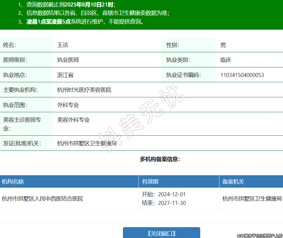 姓名:王潔性別:男醫(yī)師級別:執(zhí)業(yè)醫(yī)師執(zhí)業(yè)類別:臨床執(zhí)業(yè)地點:浙江省執(zhí)業(yè)證書編碼:110341504000053主要執(zhí)業(yè)機(jī)構(gòu):杭州時光醫(yī)療美容醫(yī)院執(zhí)業(yè)范圍:外科專業(yè)美容主診醫(yī)師專業(yè):美容外科專業(yè)發(fā)證(批準(zhǔn))機(jī)關(guān):杭州市拱墅區(qū)衛(wèi)生健康局多機(jī)構(gòu)備案信息:機(jī)構(gòu)名稱 有效期 備案機(jī)關(guān) 杭州市拱墅區(qū)人民中西醫(yī)結(jié)合醫(yī)院 開始:2024-12-01結(jié)束:2027-11-30杭州市拱墅區(qū)衛(wèi)生健康局 -