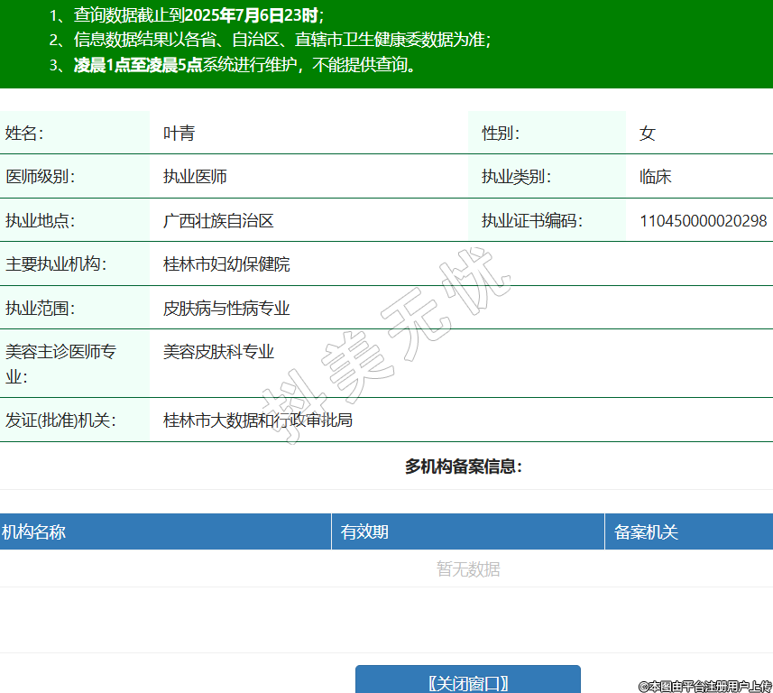 姓名:葉青性別:女醫(yī)師級(jí)別:執(zhí)業(yè)醫(yī)師執(zhí)業(yè)類別:臨床執(zhí)業(yè)地點(diǎn):廣西壯族自治區(qū)執(zhí)業(yè)證書編碼:110450000020298主要執(zhí)業(yè)機(jī)構(gòu):桂林市婦幼保健院執(zhí)業(yè)范圍:皮膚病與性病專業(yè)美容主診醫(yī)師專業(yè):美容皮膚科專業(yè)發(fā)證(批準(zhǔn))機(jī)關(guān):桂林市大數(shù)據(jù)和行政審批局 -