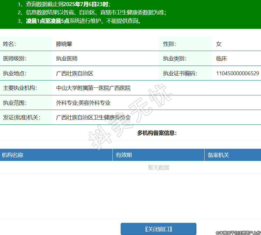 姓名:滕曉顰性別:女醫(yī)師級別:執(zhí)業(yè)醫(yī)師執(zhí)業(yè)類別:臨床執(zhí)業(yè)地點:廣西壯族自治區(qū)執(zhí)業(yè)證書編碼:110450000006529主要執(zhí)業(yè)機構(gòu):中山大學(xué)附屬第一醫(yī)院廣西醫(yī)院執(zhí)業(yè)范圍:外科專業(yè);美容外科專業(yè)發(fā)證(批準(zhǔn))機關(guān):廣西壯族自治區(qū)衛(wèi)生健康委員會 -