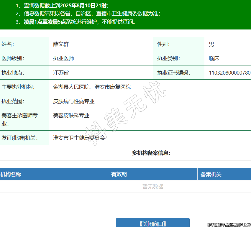 姓名:薛文群性別:男醫(yī)師級(jí)別:執(zhí)業(yè)醫(yī)師執(zhí)業(yè)類別:臨床執(zhí)業(yè)地點(diǎn):江蘇省執(zhí)業(yè)證書(shū)編碼:110320800000780主要執(zhí)業(yè)機(jī)構(gòu):金湖縣人民醫(yī)院、淮安市康復(fù)醫(yī)院執(zhí)業(yè)范圍:皮膚病與性病專業(yè)美容主診醫(yī)師專業(yè):美容皮膚科專業(yè)發(fā)證(批準(zhǔn))機(jī)關(guān):淮安市衛(wèi)生健康委員會(huì) -