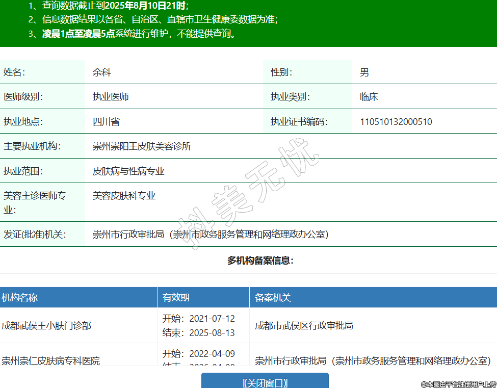 姓名:余科性別:男醫(yī)師級別:執(zhí)業(yè)醫(yī)師執(zhí)業(yè)類別:臨床執(zhí)業(yè)地點:四川省執(zhí)業(yè)證書編碼:110510132000510主要執(zhí)業(yè)機構(gòu):崇州崇陽王皮膚美容診所執(zhí)業(yè)范圍:皮膚病與性病專業(yè)美容主診醫(yī)師專業(yè):美容皮膚科專業(yè)發(fā)證(批準(zhǔn))機關(guān):崇州市行政審批局(崇州市政務(wù)服務(wù)管理和網(wǎng)絡(luò)理政辦公室)多機構(gòu)備案信息:機構(gòu)名稱 有效期 備案機關(guān) 成都武侯王小膚門診部 開始:2021-07-12結(jié)束:2025-08-13成都市武侯區(qū)行政審批局 崇州崇仁皮膚病專科醫(yī)院 開始:2022-04-09結(jié)束:2026-04-08崇州市行政審批局(崇州市政務(wù)服務(wù)管理和網(wǎng)絡(luò)理政辦公室) 崇州謝雪冰皮膚診所 開始:2023-10-21結(jié)束:2026-10-20崇州市行政審批局(崇州市政務(wù)服務(wù)管理和網(wǎng)絡(luò)理政辦公室) 崇州崇仁醫(yī)院 開始:2024-02-01結(jié)束:2029-01-30崇州市行政審批局(崇州市政務(wù)服務(wù)管理和網(wǎng)絡(luò)理政辦公室) 崇州崇陽漢密爾頓醫(yī)學(xué)美容門診部 開始:2025-06-10結(jié)束:2026-06-09崇州市行政審批局(崇州市政務(wù)服務(wù)管理和網(wǎng)絡(luò)理政辦公室) -