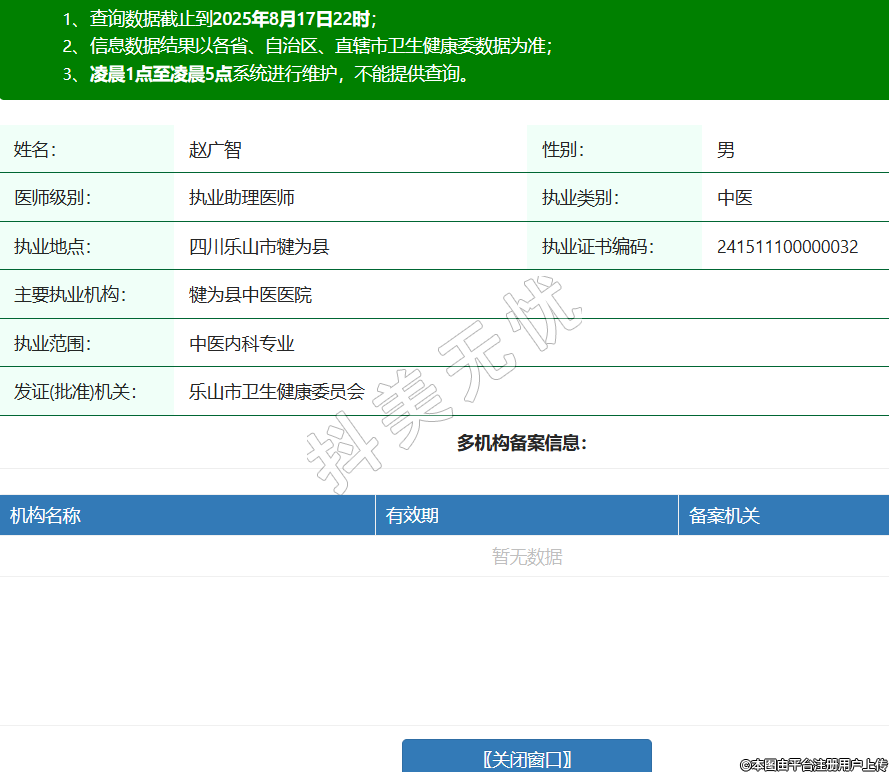 姓名:趙廣智性別:男醫(yī)師級(jí)別:執(zhí)業(yè)助理醫(yī)師執(zhí)業(yè)類(lèi)別:中醫(yī)執(zhí)業(yè)地點(diǎn):四川樂(lè)山市犍為縣執(zhí)業(yè)證書(shū)編碼:241511100000032主要執(zhí)業(yè)機(jī)構(gòu):犍為縣中醫(yī)醫(yī)院執(zhí)業(yè)范圍:中醫(yī)內(nèi)科專(zhuān)業(yè)發(fā)證(批準(zhǔn))機(jī)關(guān):樂(lè)山市衛(wèi)生健康委員會(huì) -
