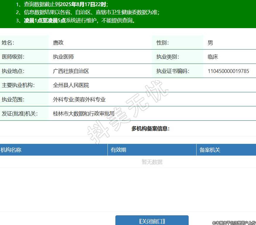 姓名:唐政性別:男醫(yī)師級別:執(zhí)業(yè)醫(yī)師執(zhí)業(yè)類別:臨床執(zhí)業(yè)地點(diǎn):廣西壯族自治區(qū)執(zhí)業(yè)證書編碼:110450000019785主要執(zhí)業(yè)機(jī)構(gòu):全州縣人民醫(yī)院執(zhí)業(yè)范圍:外科專業(yè);美容外科專業(yè)發(fā)證(批準(zhǔn))機(jī)關(guān):桂林市大數(shù)據(jù)和行政審批局 -