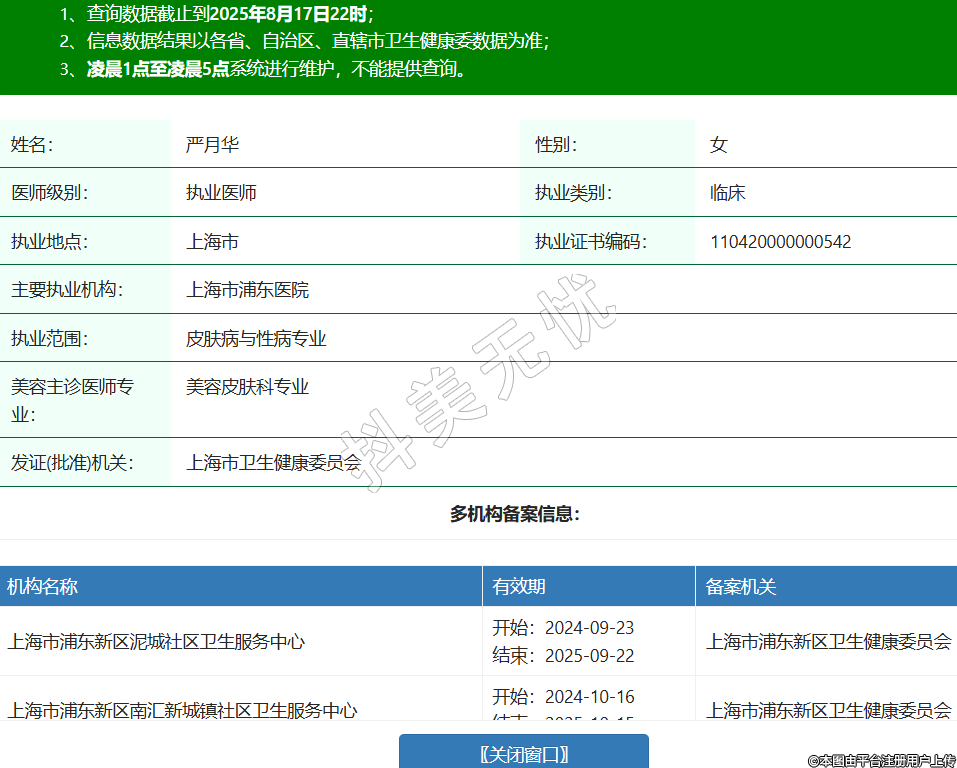 姓名:嚴月華性別:女醫(yī)師級別:執(zhí)業(yè)醫(yī)師執(zhí)業(yè)類別:臨床執(zhí)業(yè)地點:上海市執(zhí)業(yè)證書編碼:110420000000542主要執(zhí)業(yè)機構(gòu):上海市浦東醫(yī)院執(zhí)業(yè)范圍:皮膚病與性病專業(yè)美容主診醫(yī)師專業(yè):美容皮膚科專業(yè)發(fā)證(批準)機關:上海市衛(wèi)生健康委員會多機構(gòu)備案信息:機構(gòu)名稱 有效期 備案機關 上海市浦東新區(qū)泥城社區(qū)衛(wèi)生服務中心 開始:2024-09-23結(jié)束:2025-09-22上海市浦東新區(qū)衛(wèi)生健康委員會 上海市浦東新區(qū)南匯新城鎮(zhèn)社區(qū)衛(wèi)生服務中心 開始:2024-10-16結(jié)束:2025-10-15上海市浦東新區(qū)衛(wèi)生健康委員會 -