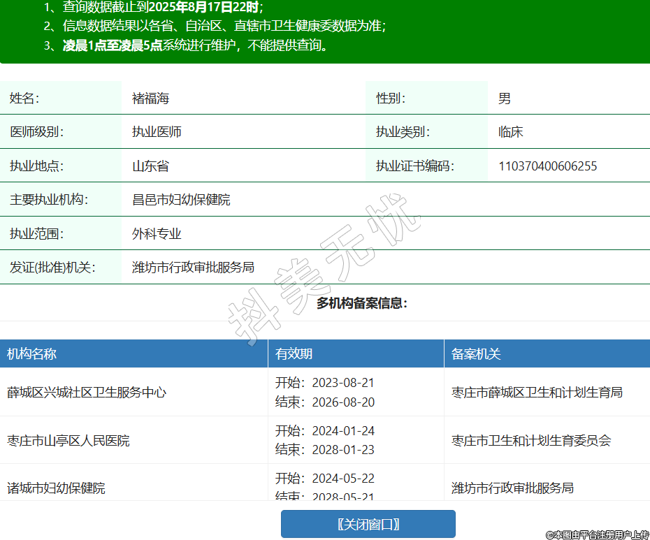 姓名:褚福海性別:男醫(yī)師級(jí)別:執(zhí)業(yè)醫(yī)師執(zhí)業(yè)類別:臨床執(zhí)業(yè)地點(diǎn):山東省執(zhí)業(yè)證書編碼:110370400606255主要執(zhí)業(yè)機(jī)構(gòu):昌邑市婦幼保健院執(zhí)業(yè)范圍:外科專業(yè)發(fā)證(批準(zhǔn))機(jī)關(guān):濰坊市行政審批服務(wù)局多機(jī)構(gòu)備案信息:機(jī)構(gòu)名稱 有效期 備案機(jī)關(guān) 薛城區(qū)興城社區(qū)衛(wèi)生服務(wù)中心 開始:2023-08-21結(jié)束:2026-08-20棗莊市薛城區(qū)衛(wèi)生和計(jì)劃生育局 棗莊市山亭區(qū)人民醫(yī)院 開始:2024-01-24結(jié)束:2028-01-23棗莊市衛(wèi)生和計(jì)劃生育委員會(huì) 諸城市婦幼保健院 開始:2024-05-22結(jié)束:2028-05-21濰坊市行政審批服務(wù)局 -