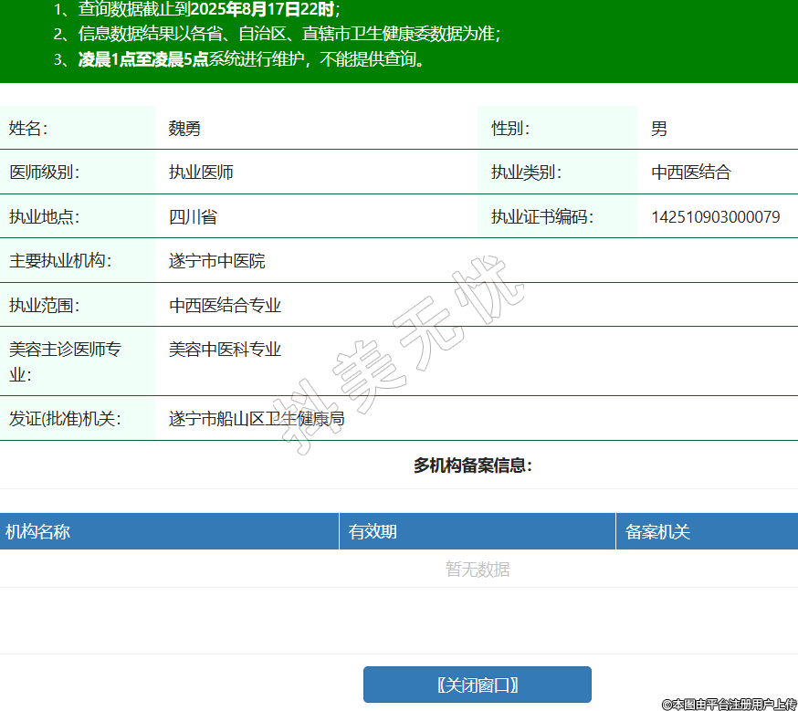 姓名:魏勇性別:男醫(yī)師級別:執(zhí)業(yè)醫(yī)師執(zhí)業(yè)類別:中西醫(yī)結(jié)合執(zhí)業(yè)地點:四川省執(zhí)業(yè)證書編碼:142510903000079主要執(zhí)業(yè)機構(gòu):遂寧市中醫(yī)院執(zhí)業(yè)范圍:中西醫(yī)結(jié)合專業(yè)美容主診醫(yī)師專業(yè):美容中醫(yī)科專業(yè)發(fā)證(批準(zhǔn))機關(guān):遂寧市船山區(qū)衛(wèi)生健康局 -