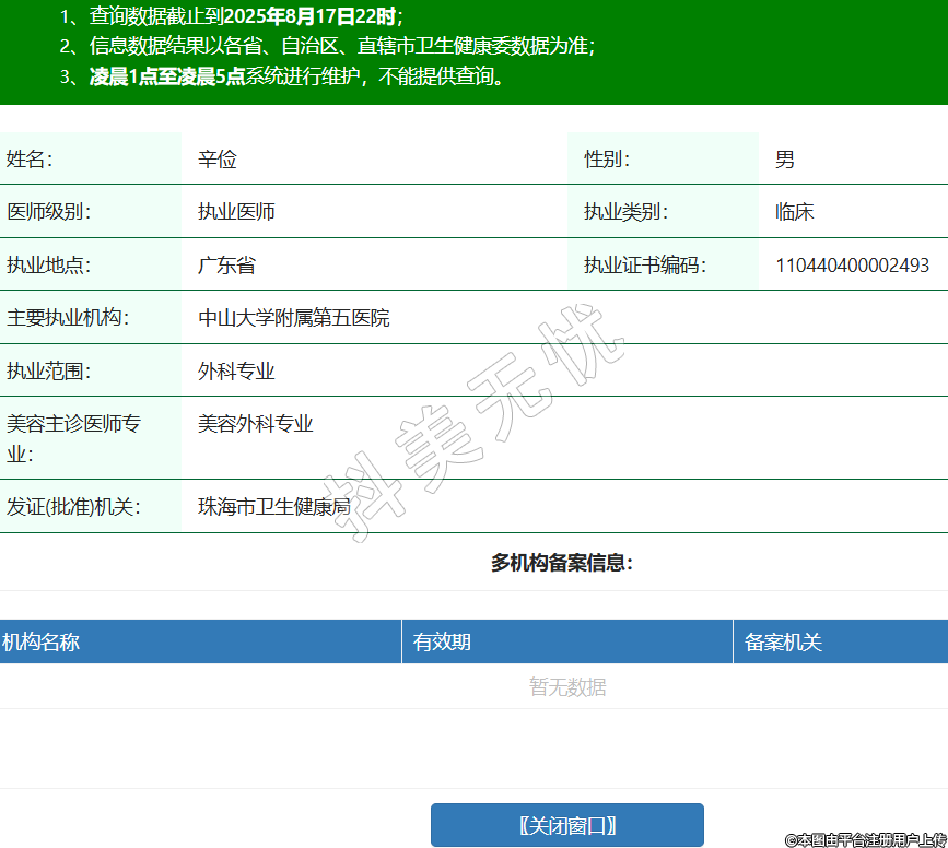 姓名:辛儉性別:男醫(yī)師級(jí)別:執(zhí)業(yè)醫(yī)師執(zhí)業(yè)類別:臨床執(zhí)業(yè)地點(diǎn):廣東省執(zhí)業(yè)證書編碼:110440400002493主要執(zhí)業(yè)機(jī)構(gòu):中山大學(xué)附屬第五醫(yī)院執(zhí)業(yè)范圍:外科專業(yè)美容主診醫(yī)師專業(yè):美容外科專業(yè)發(fā)證(批準(zhǔn))機(jī)關(guān):珠海市衛(wèi)生健康局 -