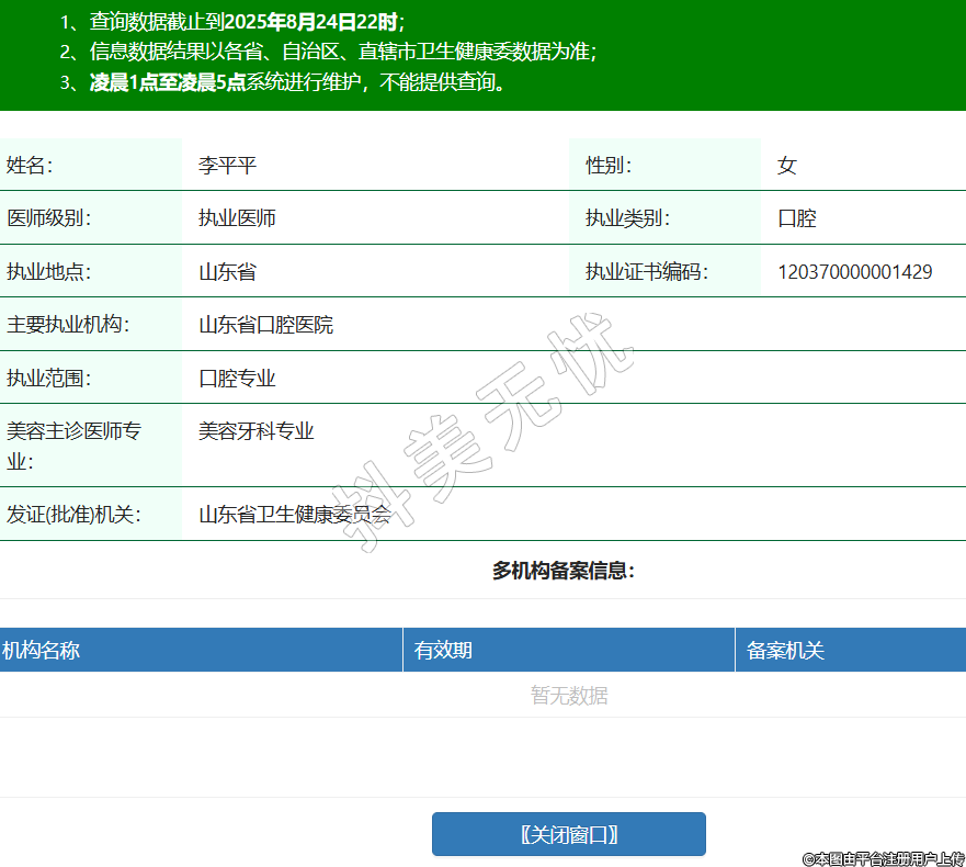 姓名:李平平性別:女醫(yī)師級(jí)別:執(zhí)業(yè)醫(yī)師執(zhí)業(yè)類(lèi)別:口腔執(zhí)業(yè)地點(diǎn):山東省執(zhí)業(yè)證書(shū)編碼:120370000001429主要執(zhí)業(yè)機(jī)構(gòu):山東省口腔醫(yī)院執(zhí)業(yè)范圍:口腔專(zhuān)業(yè)美容主診醫(yī)師專(zhuān)業(yè):美容牙科專(zhuān)業(yè)發(fā)證(批準(zhǔn))機(jī)關(guān):山東省衛(wèi)生健康委員會(huì) -