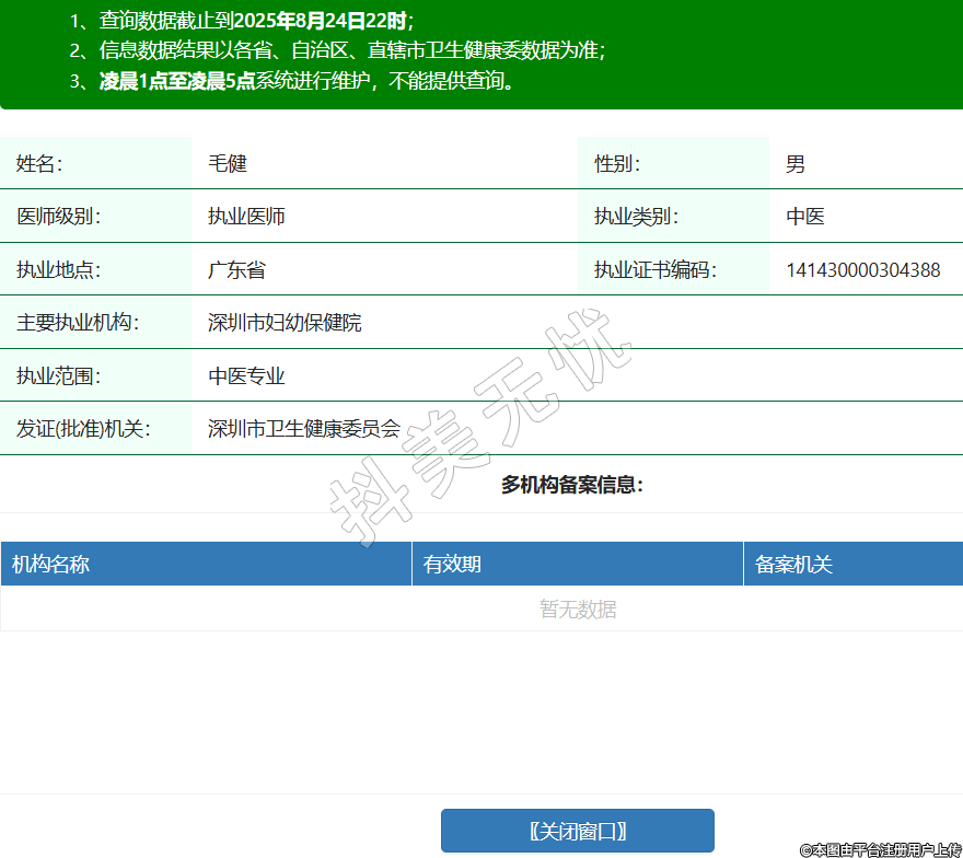 姓名:毛健性別:男醫(yī)師級別:執(zhí)業(yè)醫(yī)師執(zhí)業(yè)類別:中醫(yī)執(zhí)業(yè)地點(diǎn):廣東省執(zhí)業(yè)證書編碼:141430000304388主要執(zhí)業(yè)機(jī)構(gòu):深圳市婦幼保健院執(zhí)業(yè)范圍:中醫(yī)專業(yè)發(fā)證(批準(zhǔn))機(jī)關(guān):深圳市衛(wèi)生健康委員會(huì) -
