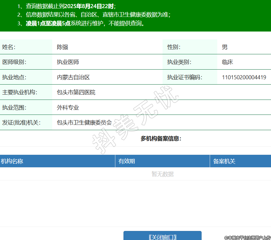 姓名:陳強(qiáng)性別:男醫(yī)師級別:執(zhí)業(yè)醫(yī)師執(zhí)業(yè)類別:臨床執(zhí)業(yè)地點(diǎn):內(nèi)蒙古自治區(qū)執(zhí)業(yè)證書編碼:110150200004419主要執(zhí)業(yè)機(jī)構(gòu):包頭市第四醫(yī)院執(zhí)業(yè)范圍:外科專業(yè)發(fā)證(批準(zhǔn))機(jī)關(guān):包頭市衛(wèi)生健康委員會(huì) -
