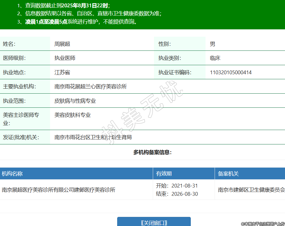 姓名:周展超性別:男醫(yī)師級別:執(zhí)業(yè)醫(yī)師執(zhí)業(yè)類別:臨床執(zhí)業(yè)地點:江蘇省執(zhí)業(yè)證書編碼:110320105000414主要執(zhí)業(yè)機構(gòu):南京雨花展超蘭心醫(yī)療美容診所執(zhí)業(yè)范圍:皮膚病與性病專業(yè)美容主診醫(yī)師專業(yè):美容皮膚科專業(yè)發(fā)證(批準)機關(guān):南京市雨花臺區(qū)衛(wèi)生和計劃生育局多機構(gòu)備案信息:機構(gòu)名稱 有效期 備案機關(guān) 南京展超醫(yī)療美容診所有限公司建鄴醫(yī)療美容診所 開始:2021-08-31結(jié)束:2026-08-30南京市建鄴區(qū)衛(wèi)生健康委員會 -
