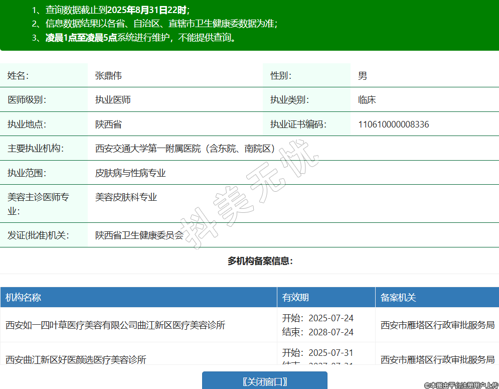 姓名:張鼎偉性別:男醫(yī)師級別:執(zhí)業(yè)醫(yī)師執(zhí)業(yè)類別:臨床執(zhí)業(yè)地點:陜西省執(zhí)業(yè)證書編碼:110610000008336主要執(zhí)業(yè)機(jī)構(gòu):西安交通大學(xué)第一附屬醫(yī)院(含東院、南院區(qū))執(zhí)業(yè)范圍:皮膚病與性病專業(yè)美容主診醫(yī)師專業(yè):美容皮膚科專業(yè)發(fā)證(批準(zhǔn))機(jī)關(guān):陜西省衛(wèi)生健康委員會多機(jī)構(gòu)備案信息:機(jī)構(gòu)名稱 有效期 備案機(jī)關(guān) 西安如一四葉草醫(yī)療美容有限公司曲江新區(qū)醫(yī)療美容診所 開始:2025-07-24結(jié)束:2028-07-24西安市雁塔區(qū)行政審批服務(wù)局 西安曲江新區(qū)好醫(yī)顏選醫(yī)療美容診所 開始:2025-07-31結(jié)束:2027-07-31西安市雁塔區(qū)行政審批服務(wù)局 -