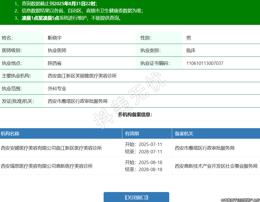 姓名:靳曉宇性別:男醫(yī)師級別:執(zhí)業(yè)醫(yī)師執(zhí)業(yè)類別:臨床執(zhí)業(yè)地點:陜西省執(zhí)業(yè)證書編碼:110610113007037主要執(zhí)業(yè)機構(gòu):西安曲江新區(qū)芙麗雅醫(yī)療美容診所執(zhí)業(yè)范圍:外科專業(yè)發(fā)證(批準)機關(guān):西安市雁塔區(qū)行政審批服務(wù)局多機構(gòu)備案信息:機構(gòu)名稱 有效期 備案機關(guān) 西安安媛醫(yī)療美容有限公司曲江新區(qū)醫(yī)療美容診所 開始:2025-07-11結(jié)束:2028-07-11西安市雁塔區(qū)行政審批服務(wù)局 西安瑞思醫(yī)療美容有限公司高新醫(yī)療美容診所 開始:2025-08-18結(jié)束:2028-08-18西安高新技術(shù)產(chǎn)業(yè)開發(fā)區(qū)社會事業(yè)服務(wù)局 -