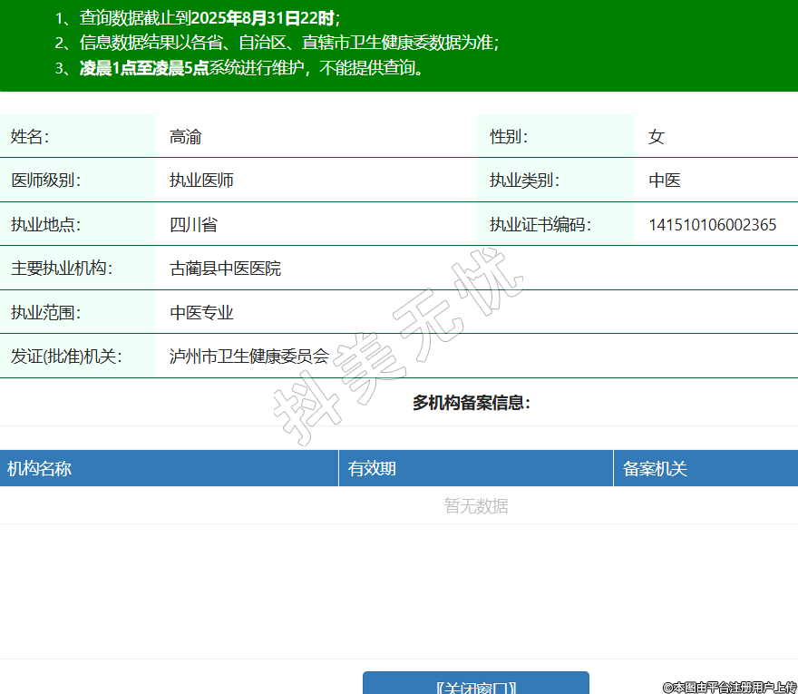 姓名:高渝性別:女醫(yī)師級(jí)別:執(zhí)業(yè)醫(yī)師執(zhí)業(yè)類別:中醫(yī)執(zhí)業(yè)地點(diǎn):四川省執(zhí)業(yè)證書編碼:141510106002365主要執(zhí)業(yè)機(jī)構(gòu):古藺縣中醫(yī)醫(yī)院執(zhí)業(yè)范圍:中醫(yī)專業(yè)發(fā)證(批準(zhǔn))機(jī)關(guān):瀘州市衛(wèi)生健康委員會(huì) -