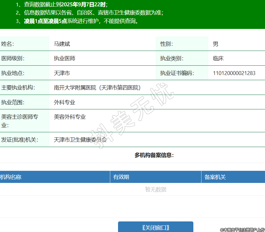 姓名:馬建斌性別:男醫(yī)師級(jí)別:執(zhí)業(yè)醫(yī)師執(zhí)業(yè)類(lèi)別:臨床執(zhí)業(yè)地點(diǎn):天津市執(zhí)業(yè)證書(shū)編碼:110120000021283主要執(zhí)業(yè)機(jī)構(gòu):南開(kāi)大學(xué)附屬醫(yī)院(天津市第四醫(yī)院)執(zhí)業(yè)范圍:外科專(zhuān)業(yè)美容主診醫(yī)師專(zhuān)業(yè):美容外科專(zhuān)業(yè)發(fā)證(批準(zhǔn))機(jī)關(guān):天津市衛(wèi)生健康委員會(huì) -
