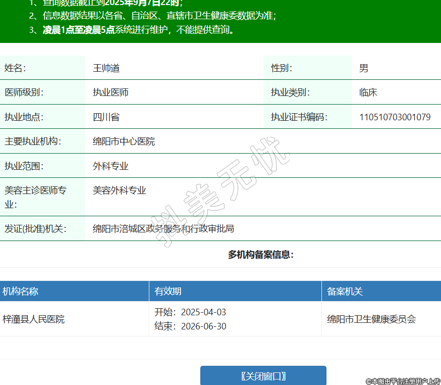 姓名:王帥道性別:男醫(yī)師級(jí)別:執(zhí)業(yè)醫(yī)師執(zhí)業(yè)類別:臨床執(zhí)業(yè)地點(diǎn):四川省執(zhí)業(yè)證書編碼:110510703001079主要執(zhí)業(yè)機(jī)構(gòu):綿陽(yáng)市中心醫(yī)院執(zhí)業(yè)范圍:外科專業(yè)美容主診醫(yī)師專業(yè):美容外科專業(yè)發(fā)證(批準(zhǔn))機(jī)關(guān):綿陽(yáng)市涪城區(qū)政務(wù)服務(wù)和行政審批局多機(jī)構(gòu)備案信息:機(jī)構(gòu)名稱 有效期 備案機(jī)關(guān) 梓潼縣人民醫(yī)院 開(kāi)始:2025-04-03結(jié)束:2026-06-30綿陽(yáng)市衛(wèi)生健康委員會(huì) -