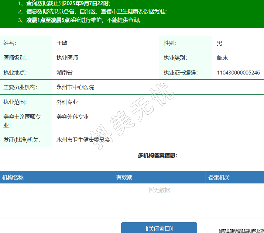 姓名:于敏性別:男醫(yī)師級別:執(zhí)業(yè)醫(yī)師執(zhí)業(yè)類別:臨床執(zhí)業(yè)地點(diǎn):湖南省執(zhí)業(yè)證書編碼:110430000005246主要執(zhí)業(yè)機(jī)構(gòu):永州市中心醫(yī)院執(zhí)業(yè)范圍:外科專業(yè)美容主診醫(yī)師專業(yè):美容外科專業(yè)發(fā)證(批準(zhǔn))機(jī)關(guān):永州市衛(wèi)生健康委員會 -