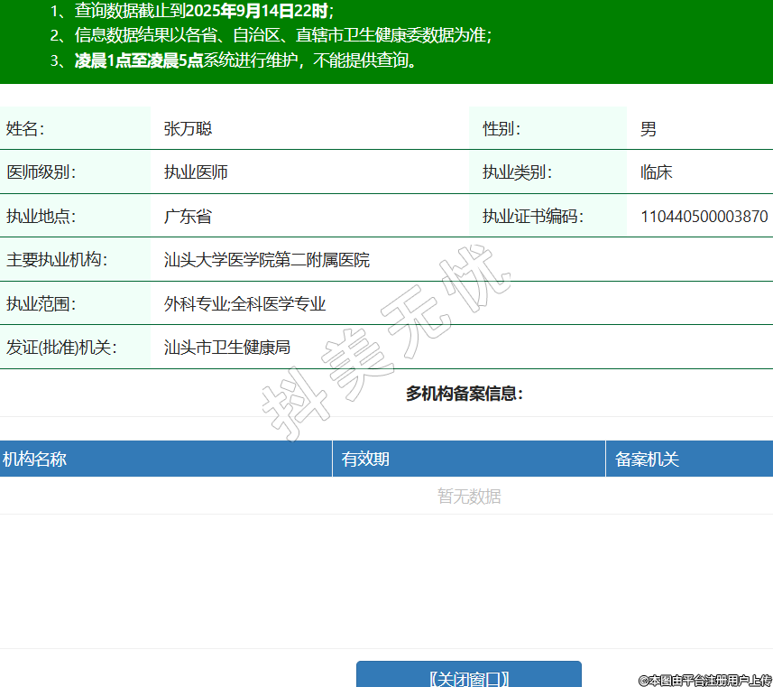 姓名:張萬聰性別:男醫(yī)師級(jí)別:執(zhí)業(yè)醫(yī)師執(zhí)業(yè)類別:臨床執(zhí)業(yè)地點(diǎn):廣東省執(zhí)業(yè)證書編碼:110440500003870主要執(zhí)業(yè)機(jī)構(gòu):汕頭大學(xué)醫(yī)學(xué)院第二附屬醫(yī)院執(zhí)業(yè)范圍:外科專業(yè);全科醫(yī)學(xué)專業(yè)發(fā)證(批準(zhǔn))機(jī)關(guān):汕頭市衛(wèi)生健康局 -