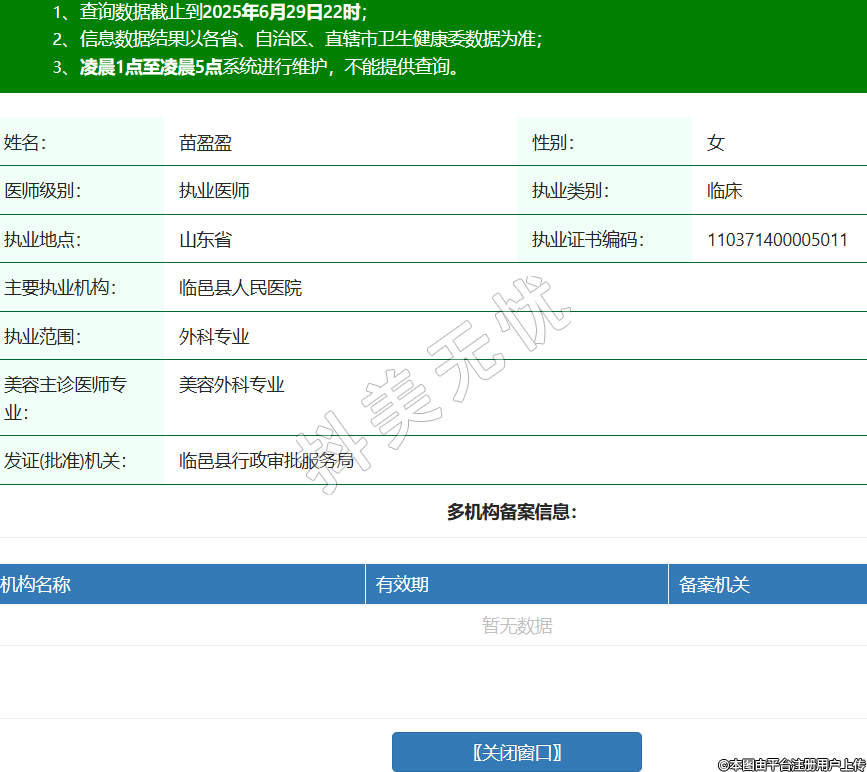 姓名:苗盈盈性別:女醫(yī)師級別:執(zhí)業(yè)醫(yī)師執(zhí)業(yè)類別:臨床執(zhí)業(yè)地點:山東省執(zhí)業(yè)證書編碼:110371400005011主要執(zhí)業(yè)機構(gòu):臨邑縣人民醫(yī)院執(zhí)業(yè)范圍:外科專業(yè)美容主診醫(yī)師專業(yè):美容外科專業(yè)發(fā)證(批準(zhǔn))機關(guān):臨邑縣行政審批服務(wù)局 -