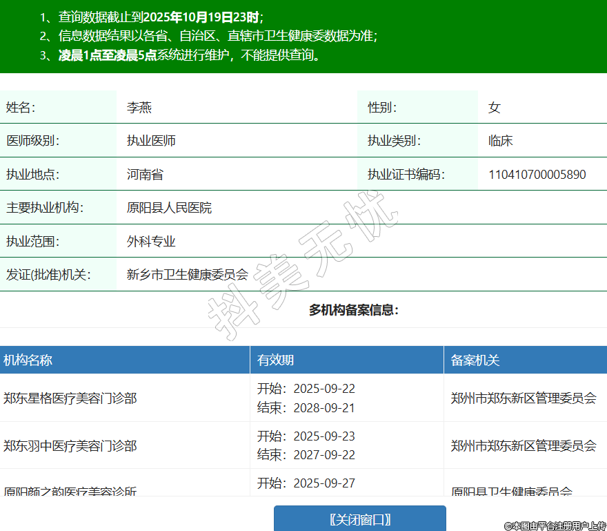 姓名:李燕性別:女醫(yī)師級別:執(zhí)業(yè)醫(yī)師執(zhí)業(yè)類別:臨床執(zhí)業(yè)地點(diǎn):河南省執(zhí)業(yè)證書編碼:110410700005890主要執(zhí)業(yè)機(jī)構(gòu):原陽縣人民醫(yī)院執(zhí)業(yè)范圍:外科專業(yè)發(fā)證(批準(zhǔn))機(jī)關(guān):新鄉(xiāng)市衛(wèi)生健康委員會多機(jī)構(gòu)備案信息:機(jī)構(gòu)名稱 有效期 備案機(jī)關(guān) 鄭東星格醫(yī)療美容門診部 開始:2025-09-22結(jié)束:2028-09-21鄭州市鄭東新區(qū)管理委員會 鄭東羽中醫(yī)療美容門診部 開始:2025-09-23結(jié)束:2027-09-22鄭州市鄭東新區(qū)管理委員會 原陽顏之韻醫(yī)療美容診所 開始:2025-09-27結(jié)束:2027-09-26原陽縣衛(wèi)生健康委員會 -