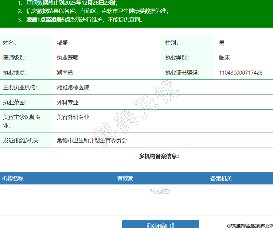姓名:鄒盛性別:男醫(yī)師級別:執(zhí)業(yè)醫(yī)師執(zhí)業(yè)類別:臨床執(zhí)業(yè)地點:湖南省執(zhí)業(yè)證書編碼:110430000717426主要執(zhí)業(yè)機構:湘雅常德醫(yī)院執(zhí)業(yè)范圍:外科專業(yè)美容主診醫(yī)師專業(yè):美容外科專業(yè)發(fā)證(批準)機關:常德市衛(wèi)生和計劃生育委員會 -