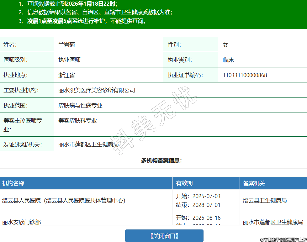 姓名:蘭巖菊性別:女醫(yī)師級別:執(zhí)業(yè)醫(yī)師執(zhí)業(yè)類別:臨床執(zhí)業(yè)地點:浙江省執(zhí)業(yè)證書編碼:110331100000868主要執(zhí)業(yè)機構(gòu):麗水熙美醫(yī)療美容診所有限公司執(zhí)業(yè)范圍:皮膚病與性病專業(yè)美容主診醫(yī)師專業(yè):美容皮膚科專業(yè)發(fā)證(批準(zhǔn))機關(guān):麗水市蓮都區(qū)衛(wèi)生健康局多機構(gòu)備案信息:機構(gòu)名稱 有效期 備案機關(guān) 縉云縣人民醫(yī)院(縉云縣人民醫(yī)院醫(yī)共體管理中心) 開始:2025-07-03結(jié)束:2028-07-01縉云縣衛(wèi)生健康局 麗水安欣門診部 開始:2025-08-16結(jié)束:2028-08-14麗水市蓮都區(qū)衛(wèi)生健康局 -