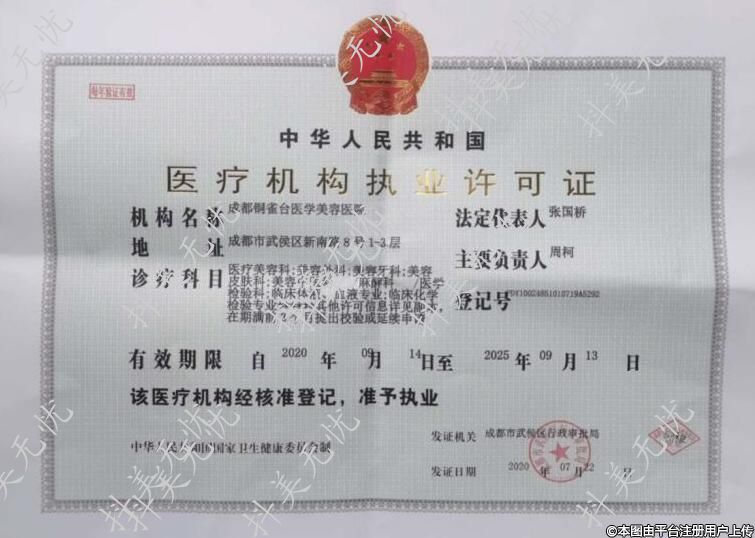 診療科目:醫(yī)療美容科;美容外科;美容牙科;美容皮膚科;美容中醫(yī)科/麻醉科/醫(yī)學(xué)檢驗科;臨床體液、血液專業(yè);臨床化學(xué)檢驗專業(yè)******其他許可信息詳見副本,在期滿前3個月提出校驗或延續(xù)申請