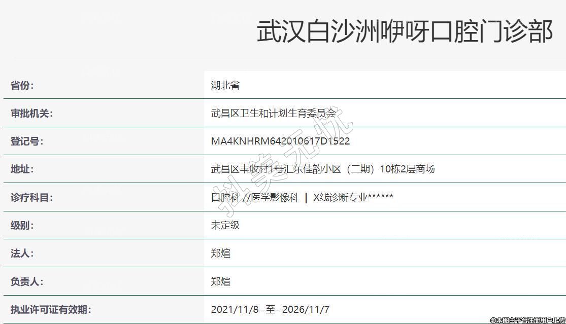 武漢咿呀口腔成立于2018-01-17,機構(gòu)位于武昌區(qū)豐收村1號匯東佳韻小區(qū)(二期)10棟2層商場,診療科目:口腔科 //醫(yī)學影像科 | X線診斷專業(yè)******