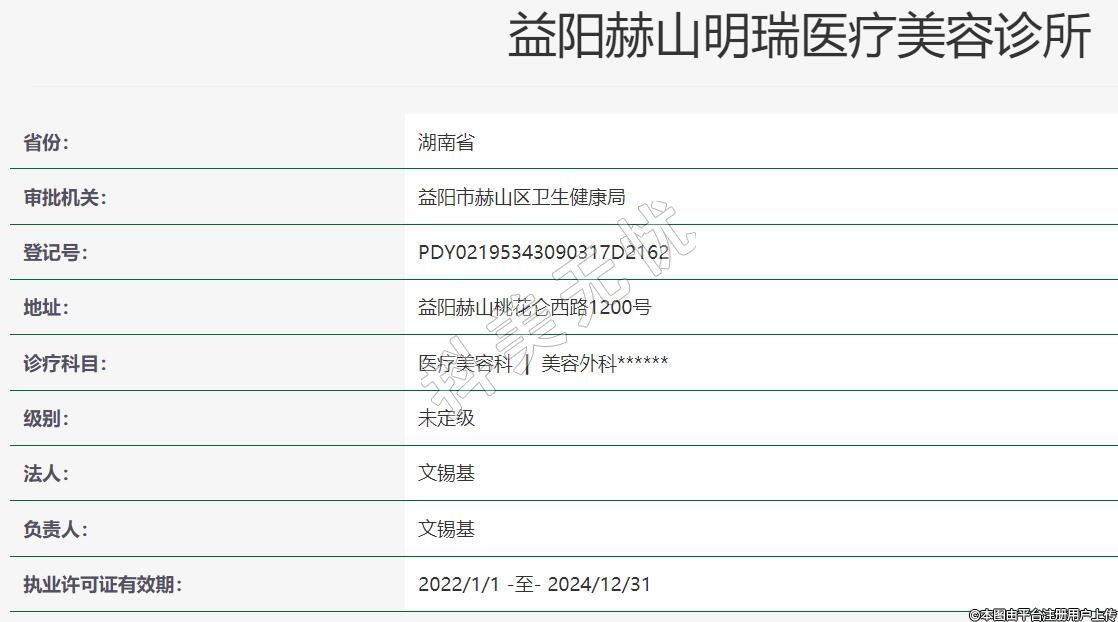益陽(yáng)赫山明瑞醫(yī)療美容2016-03-16成立,地址:益陽(yáng)赫山桃花侖西路1200號(hào),診療科目:醫(yī)療美容科 | 美容外科******