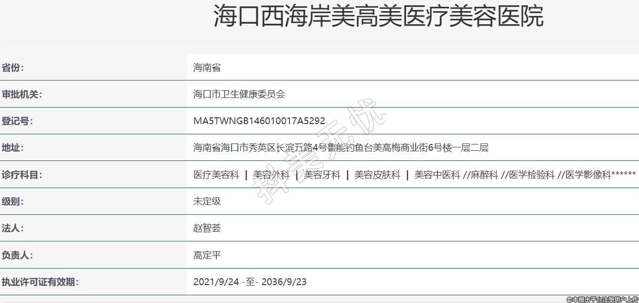海口西海岸美高美醫(yī)療美容2021-03-12成立,??谑行阌^(qū)長濱五路4號魯能釣魚臺美高梅商業(yè)街6號樓一層二層,診療科目:醫(yī)療美容科 | 美容外科 | 美容牙科 | 美容皮膚科 | 美容中醫(yī)科 //麻醉科 //醫(yī)學(xué)檢驗科 //醫(yī)學(xué)影像科******