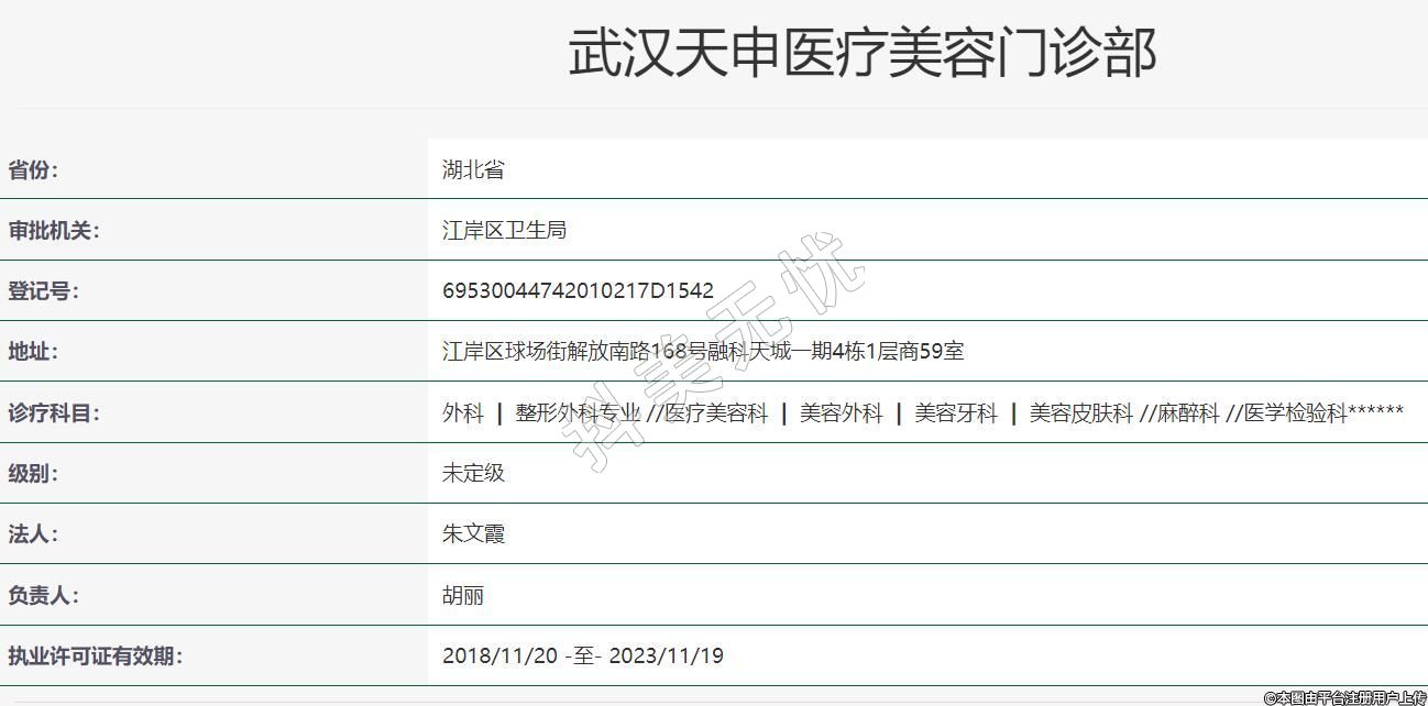 武漢天申醫(yī)療美容2019-01-08成立,地址:江岸區(qū)球場街解放南路168號融科天城一期4棟1層商59室,診療科目:外科 | 整形外科專業(yè) //醫(yī)療美容科 | 美容外科 | 美容牙科 | 美容皮膚科 //麻醉科 //醫(yī)學檢驗科******