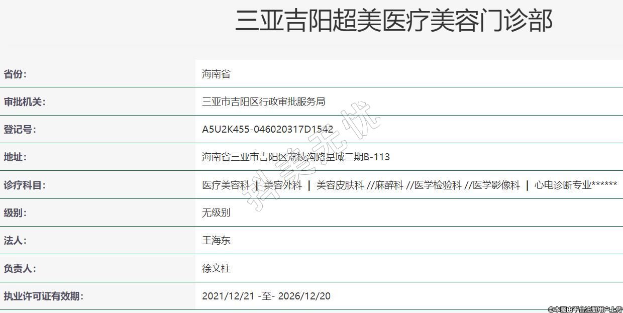 三亞超美醫(yī)療美容2022年04月08日成立,地址:海南省三亞市吉陽區(qū)荔枝溝路星域二期B-113,診療科目:醫(yī)療美容科  |  美容外科  |  美容皮膚科 //麻醉科 //醫(yī)學檢驗科 //醫(yī)學影像科  |  心電診斷專業(yè)******