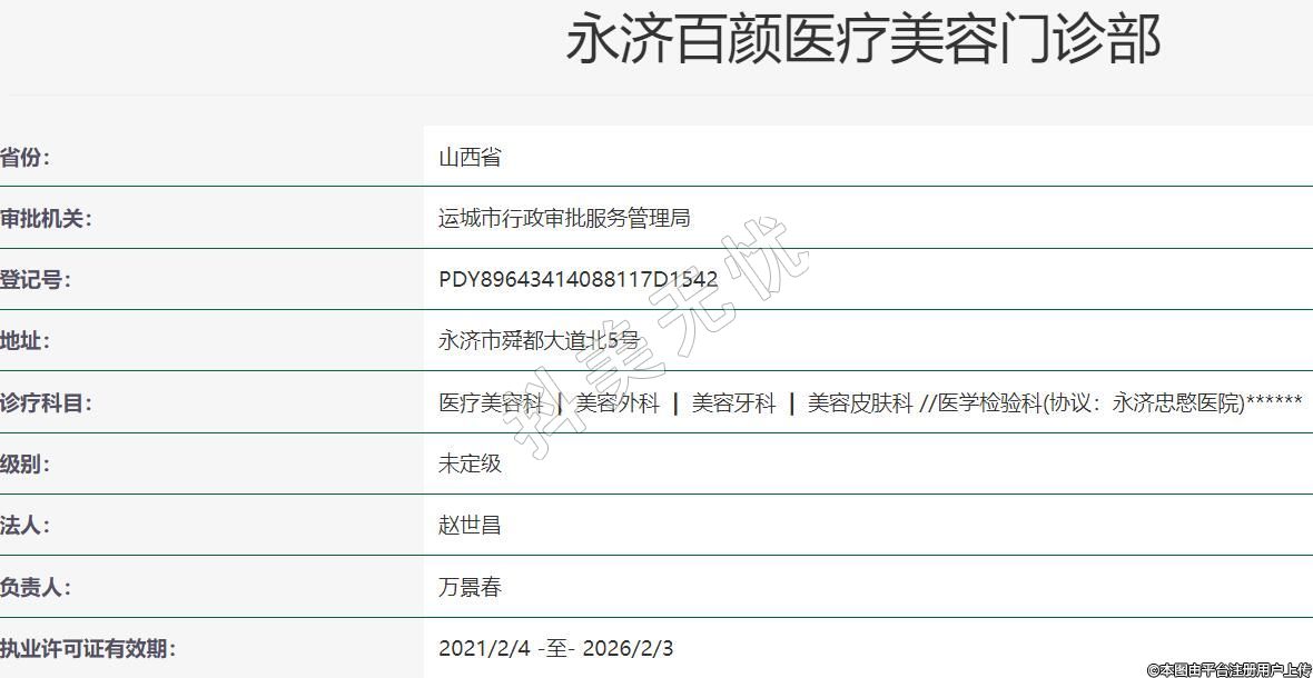 永濟百顏醫(yī)療美容門診部成立于2020年9月29日,位于山西省運城市永濟市舜都大道北5號。診療科目:醫(yī)療美容科 | 美容外科 | 美容牙科 | 美容皮膚科 //醫(yī)學檢驗科(協(xié)議:永濟忠愍醫(yī)院)******