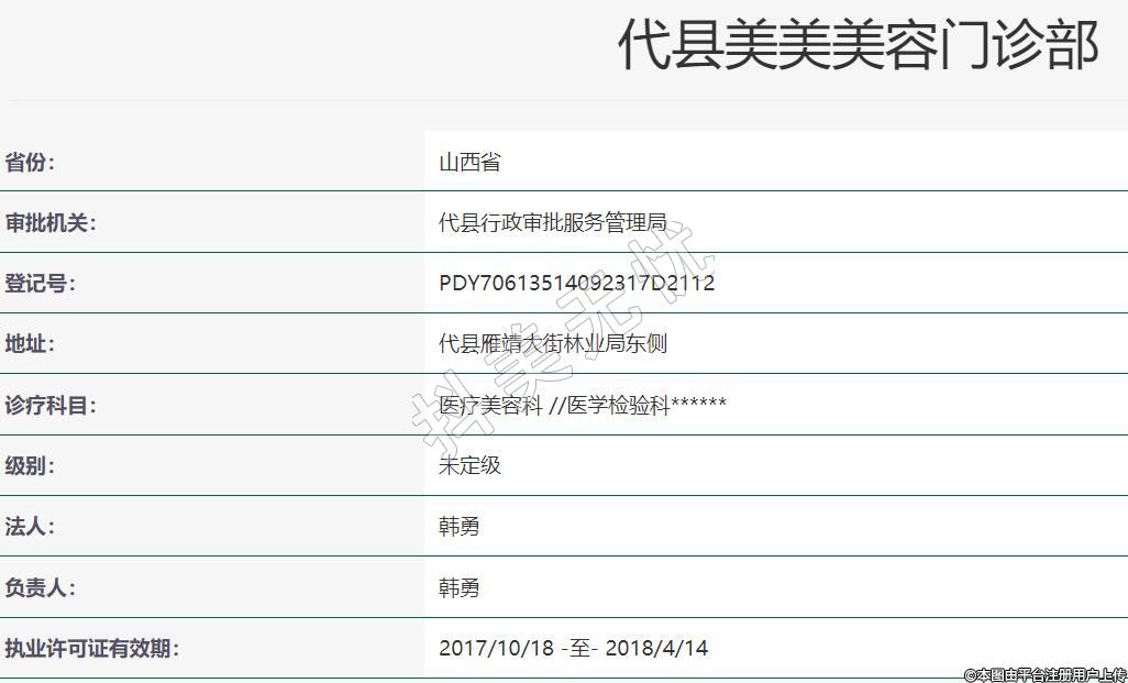 代縣美美美容2022-05-21成立,地址:代縣雁靖大街林業(yè)局東側(cè),診療科目:醫(yī)療美容科 //醫(yī)學(xué)檢驗科******