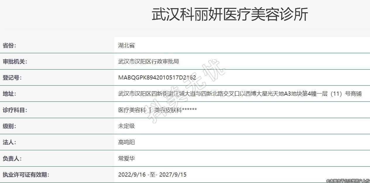 武漢科麗妍醫(yī)療美容2022年06月14日成立,地址:武漢市漢陽區(qū)四新街道江城大道與四新北路交叉口以西博大星光天地A3地塊第4幢一層(11)號(hào)商鋪,診療科目:醫(yī)療美容科 | 美容皮膚科******