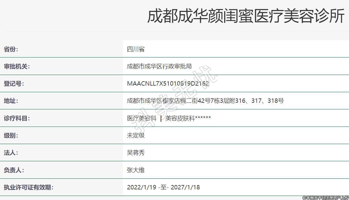 成都顏閨蜜醫(yī)療美容2021年09月18日成立,地址:成都市成華區(qū)崔家店橫二街42號7棟3層附316、317、318號,診療科目:醫(yī)療美容科 | 美容皮膚科******