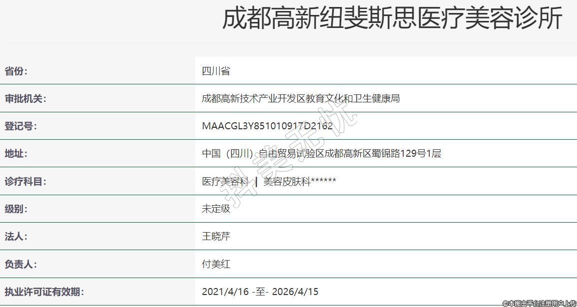 成都紐斐斯思醫(yī)療美容2021年03月22日成立,地址:中國(四川)自由貿(mào)易試驗區(qū)成都高新區(qū)蜀錦路129號1層,診療科目:醫(yī)療美容科 | 美容皮膚科******