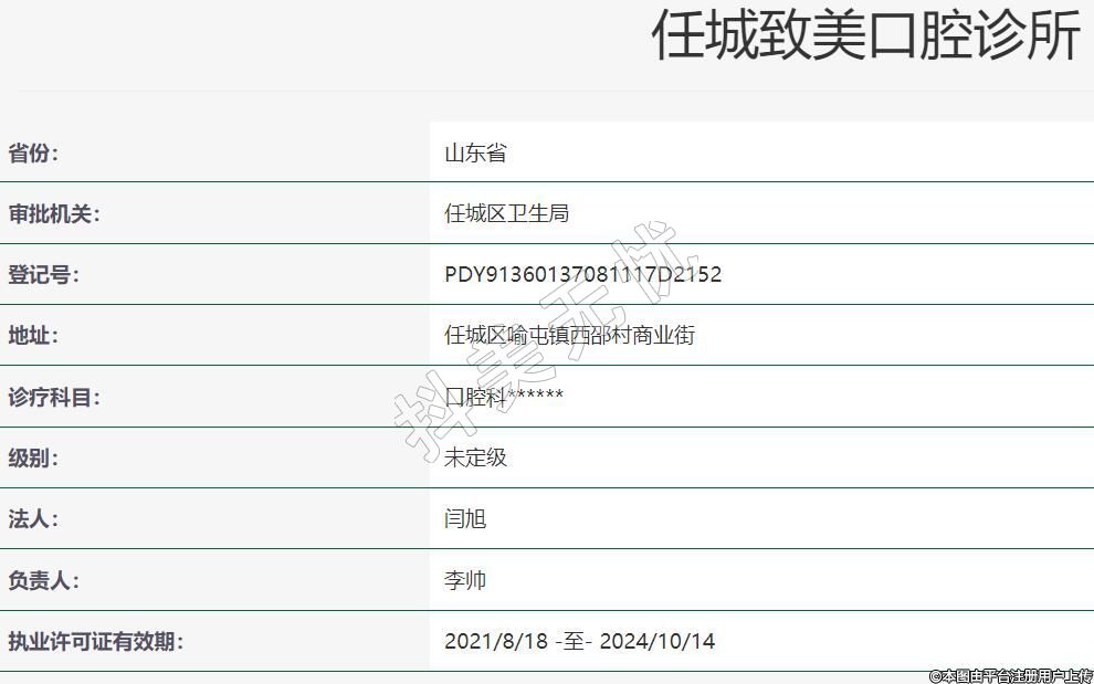 濟寧致美口腔2019-09-24成立,地址:任城區(qū)喻屯鎮(zhèn)西邵村商業(yè)街,診療科目:口腔科******