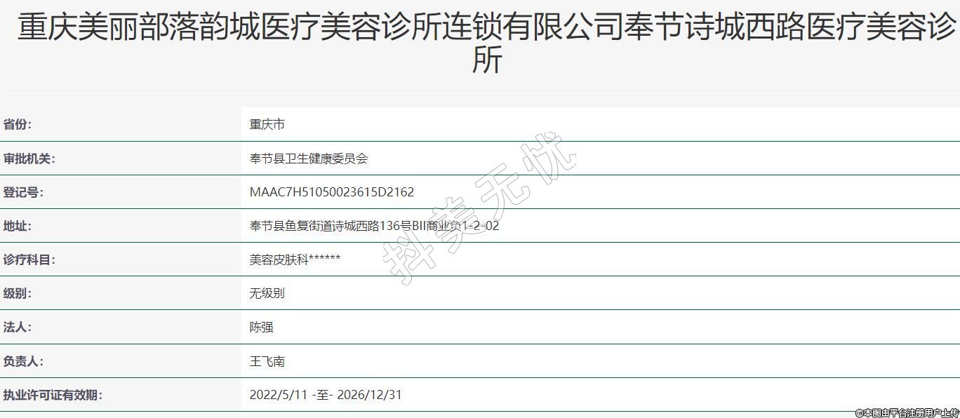 重慶美麗部落韻城醫(yī)療美容診所連鎖有限公司奉節(jié)詩城西路醫(yī)療美容診所
