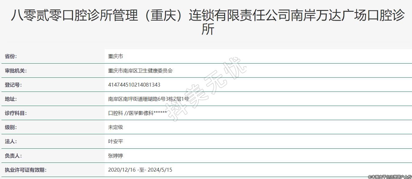 重慶八零貳零口腔(南岸)2019-03-21成立,地址:南岸區(qū)南坪街道珊瑚路6號3棟2層1號,診療科目:口腔科 //醫(yī)學影像科******