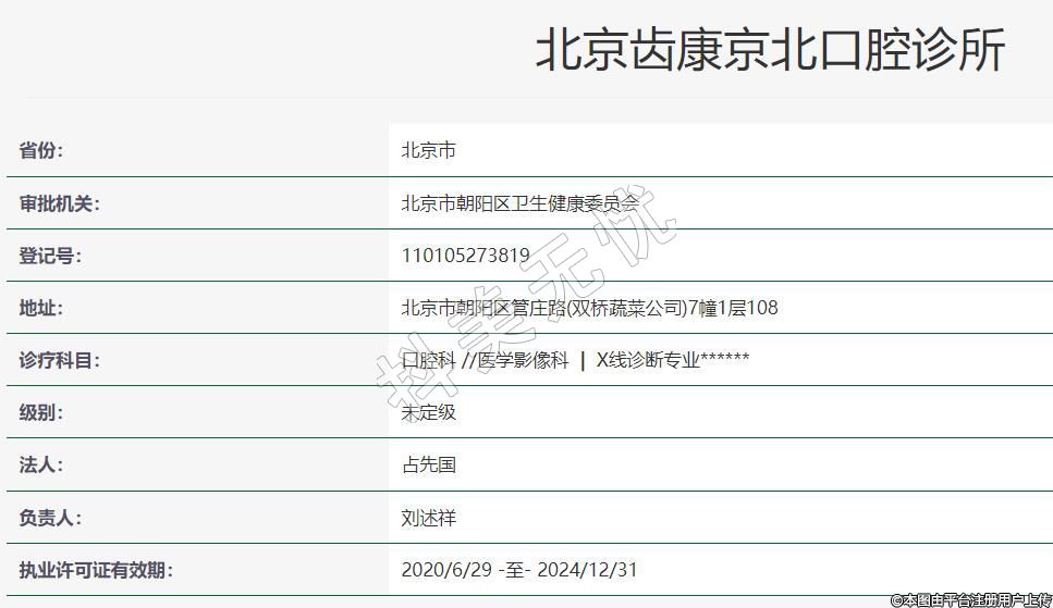 北京齒康京北口腔2019-12-20成立,地址:北京市朝陽區(qū)管莊路(雙橋蔬菜公司)7幢1層108,診療科目:口腔科 //醫(yī)學(xué)影像科 | X線診斷專業(yè)******