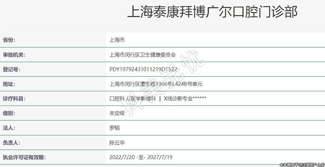 上海泰康拜博廣爾口腔2017-05-24成立,地址:上海市閔行區(qū)漕寶路3366號(hào)L424B號(hào)單元,診療科目:口腔科 //醫(yī)學(xué)影像科 | X線診斷專業(yè)******