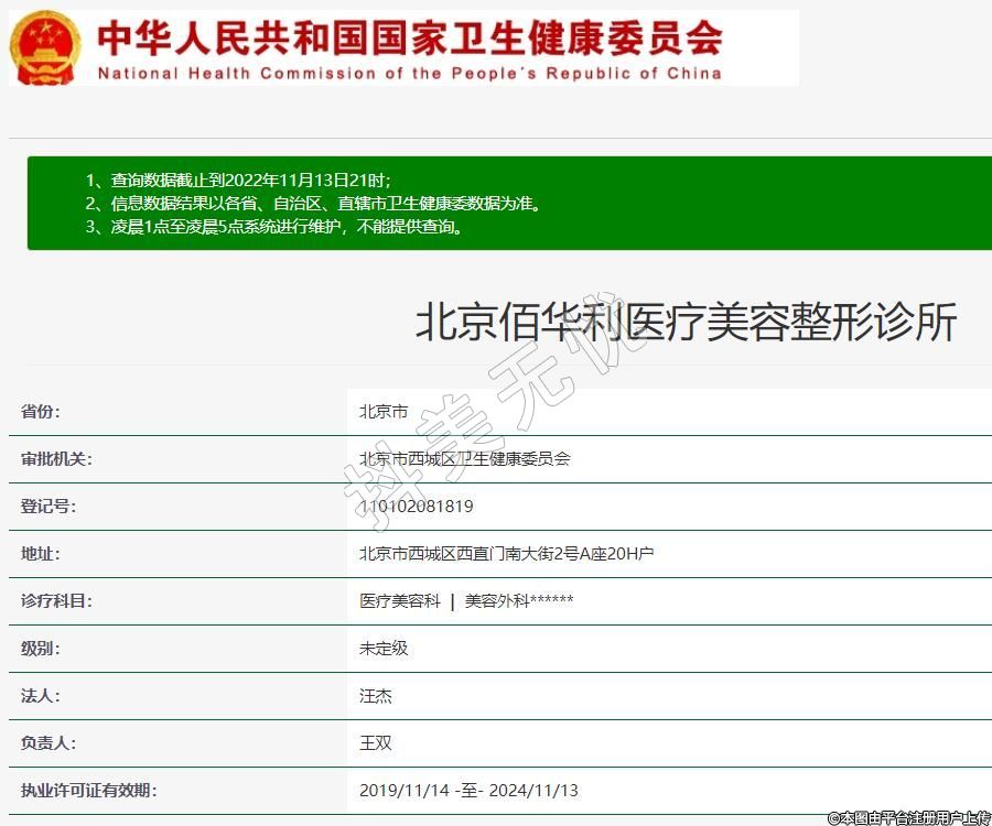 北京佰華利醫(yī)療美容2004-01-05成立,地址:北京市西城區(qū)西直門南大街2號A座20H戶,診療科目:醫(yī)療美容科 | 美容外科******