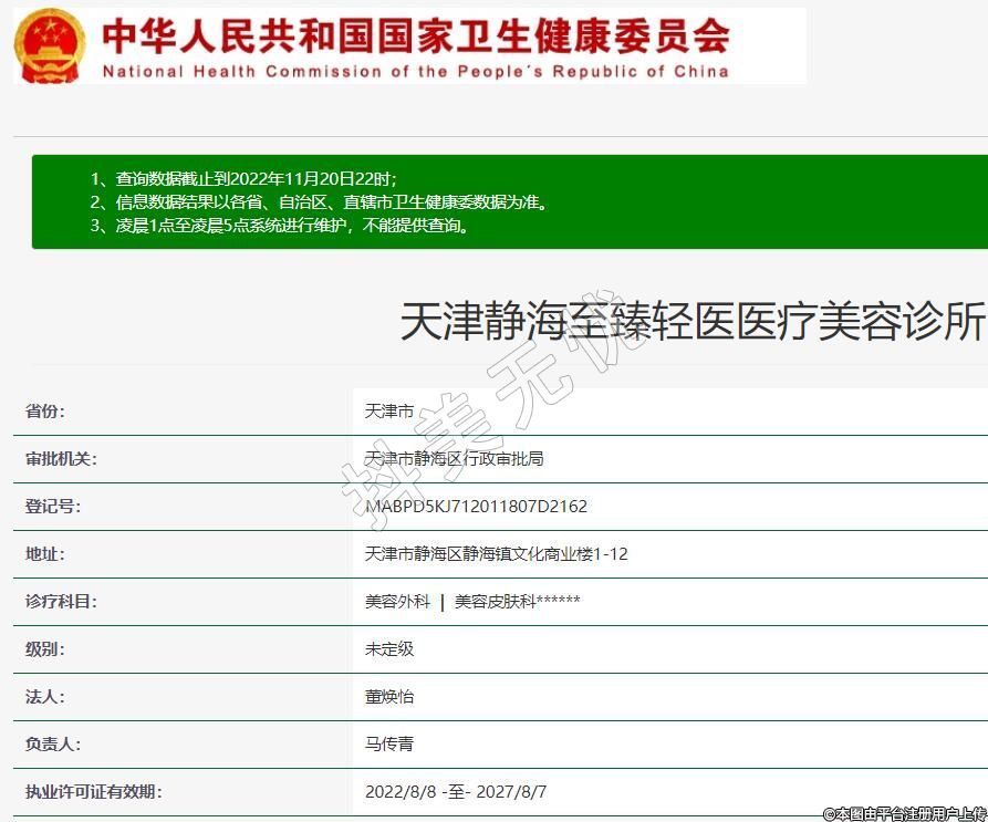 天津至臻輕醫(yī)醫(yī)療美容2022-05-30成立,地址:天津市靜海區(qū)靜海鎮(zhèn)文化商業(yè)樓1-12,診療科目:美容外科 | 美容皮膚科******