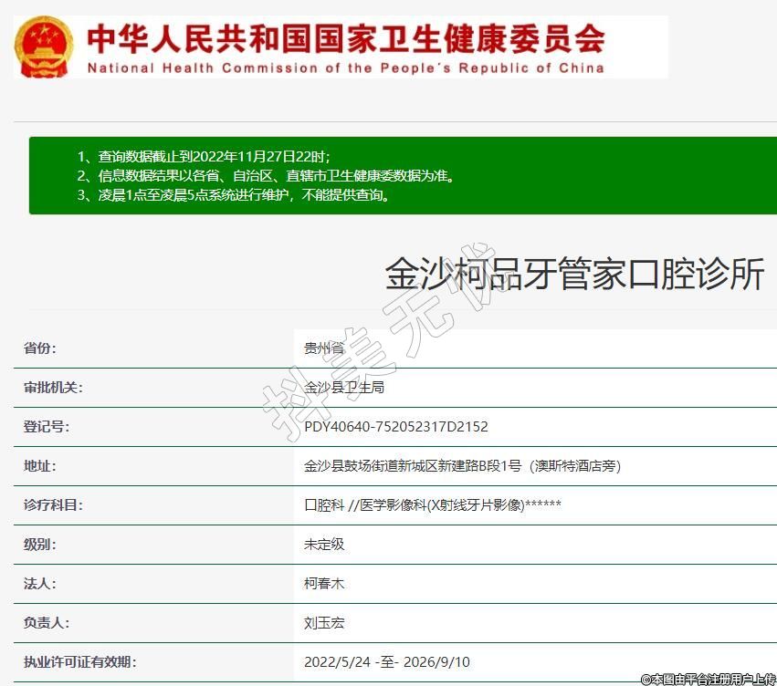 金沙柯品牙管家口腔2021-06-22成立,地址:金沙縣鼓場街道新城區(qū)新建路B段1號(hào)(澳斯特酒店旁),診療科目:口腔科 //醫(yī)學(xué)影像科(X射線牙片影像)******