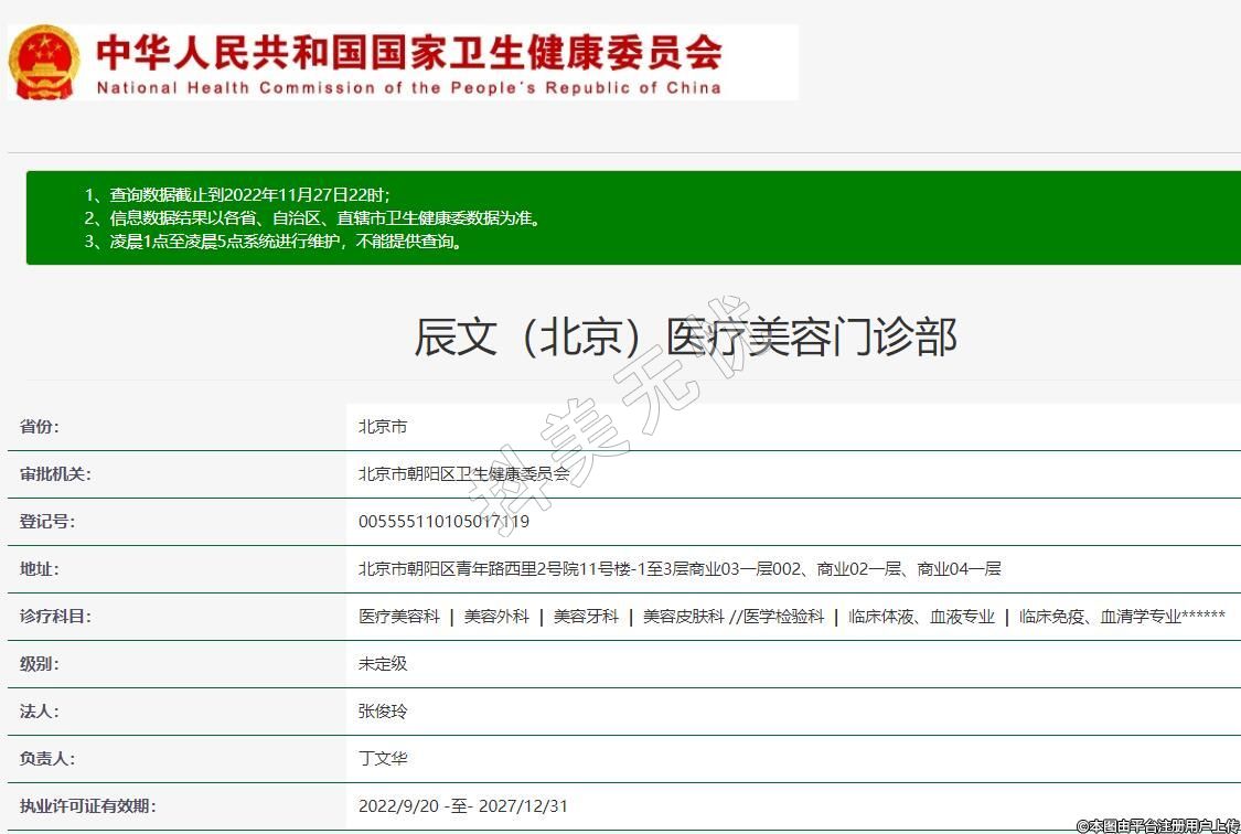 北京辰文醫(yī)療美容2021-12-09成立,診療科目:醫(yī)療美容科 | 美容外科 | 美容牙科 | 美容皮膚科 //醫(yī)學檢驗科 | 臨床體液、血液專業(yè) | 臨床免疫、血清學專業(yè)******