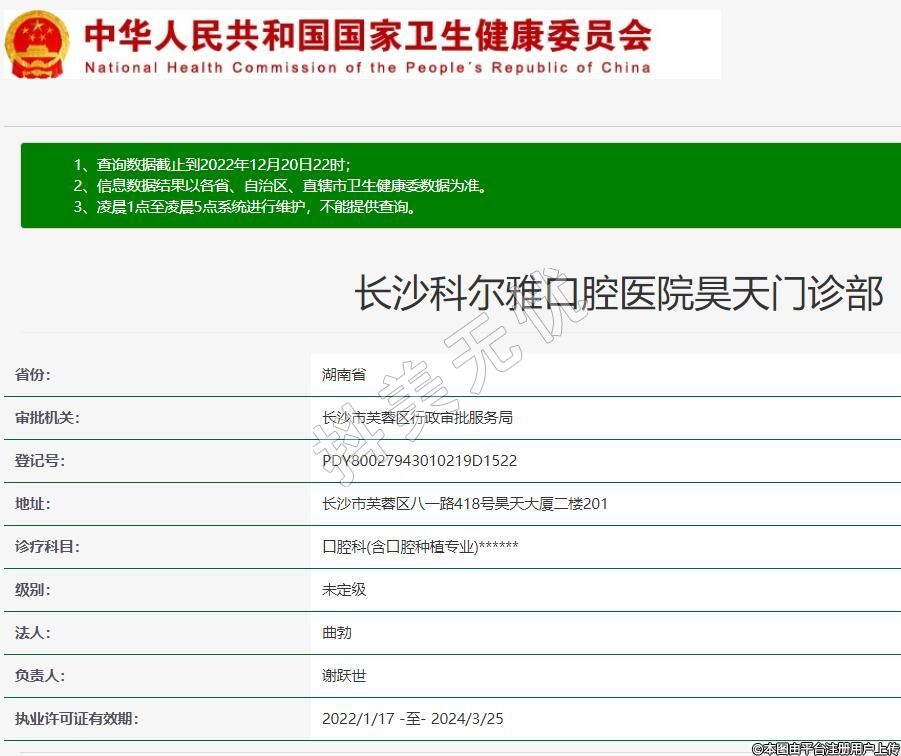 長沙科爾雅口腔(昊天),診療科目:口腔科(含口腔種植專業(yè))******