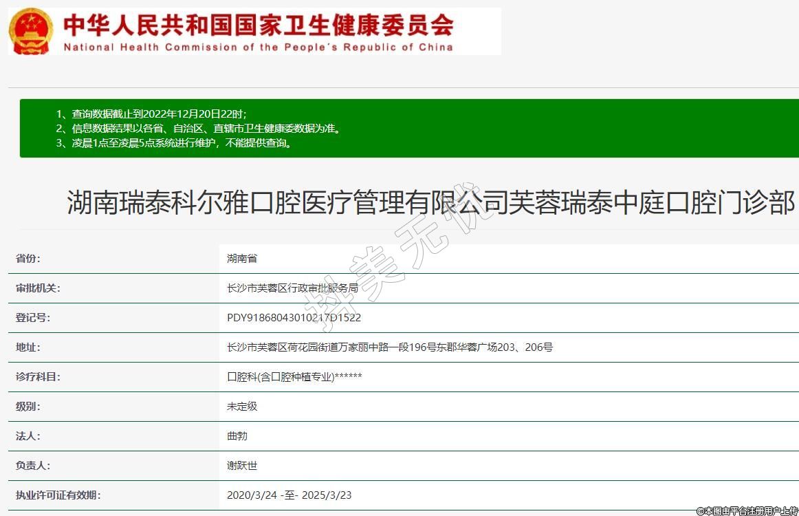湖南瑞泰科爾雅口腔醫(yī)療管理有限公司芙蓉瑞泰中庭口腔門診部